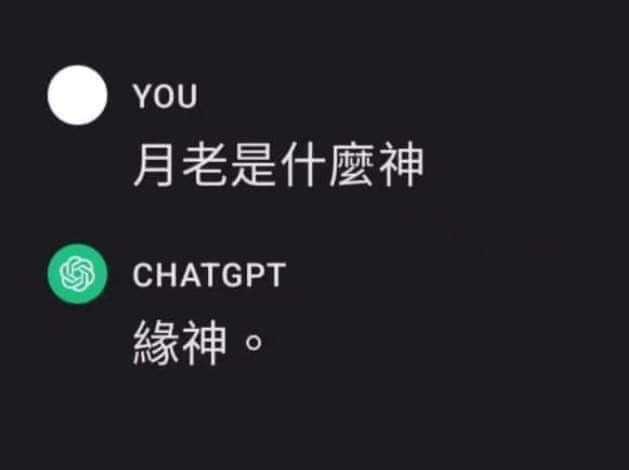 月下老人又稱「月老尊神」,被視為掌管人們姻緣之神。民間信仰中月老的職司乃是搓合男女,將姻緣簿中有姻緣關係的未婚男女以紅絲繩綁住,使其有緣人終成眷屬,故求姻緣的男女多會敬奉月老。因其為搓合緣分的神,被眾多原批們稱為「緣神」而得名。